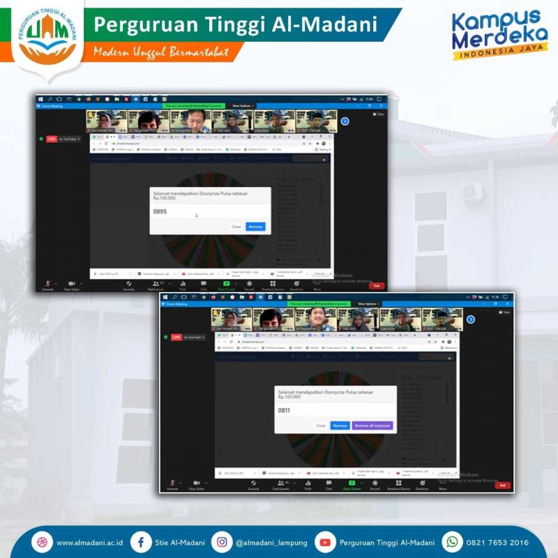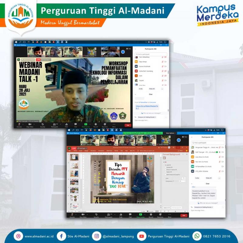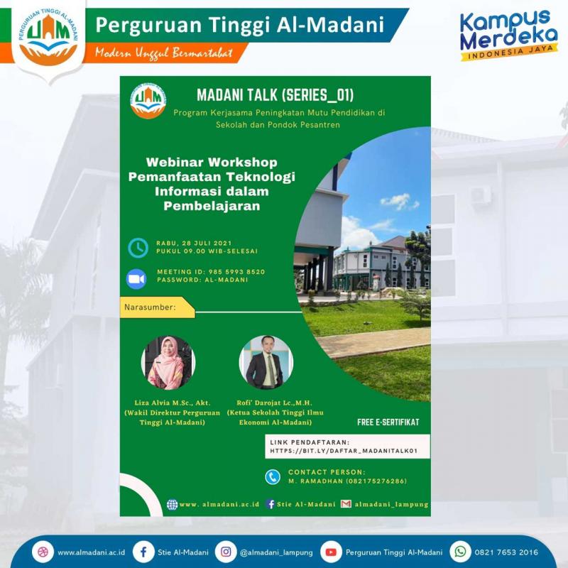 Alhamdulillah pelaksanaan Webinar Madani Talk Series-1 "Workshop Pemanfaatan Teknologi Informasi dalam Pembelajaran" telah dilaksanakan dan berjalan dengan lancar. Terimakasih kepada Bu Liza Alvia, Pak Rofi' Darojat dan Bu Dwi Susanti atas ilmu dan kesempatan yang telah diberikan dalam pemaparan materinya dalam webinar, dan juga terimakasih kepada Bapak/Ibu Panitia, Pimpinan dan Dosen serta staff atas bantuannya. 🙏